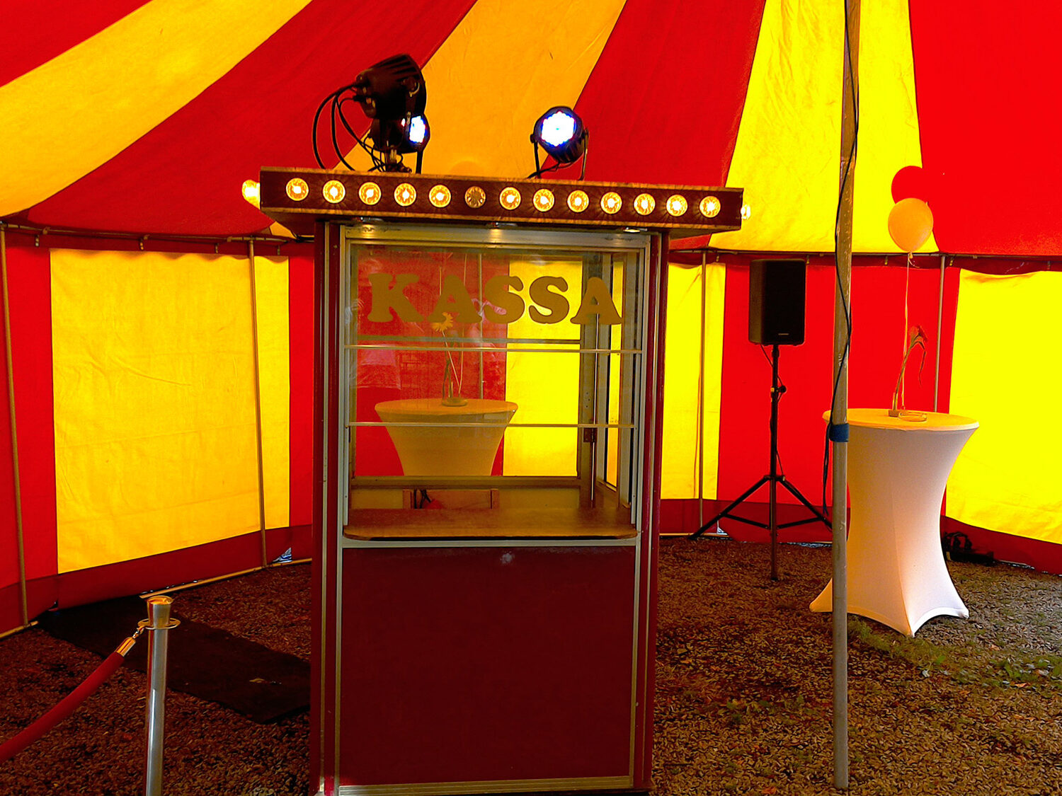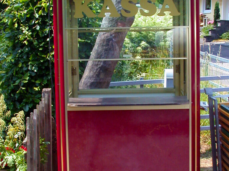 Schönes beleuchtetes Kassenhaus. 3 Seiten mit Kappenbirnen, beleuchtete Verkaufstheke mit