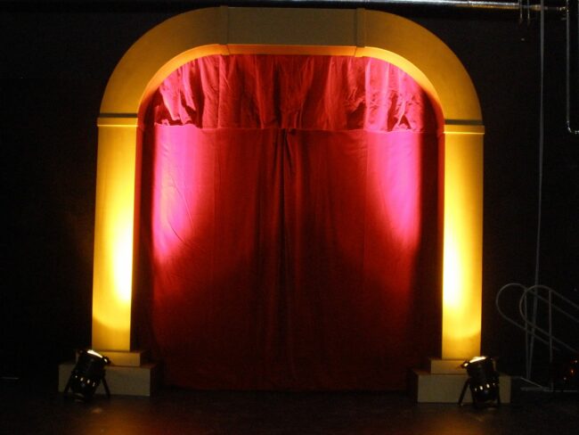 Artisteneingang in Gold mit rotem Samtvorhang.
